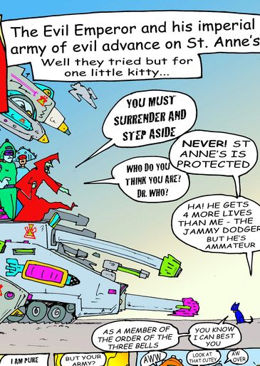 The Evil Emperor Nasticulus reigns over the Galactic Empire and is thoroughly evil, bad tempered and thinks the solution for most problems is to destroy whatever causes the problem. Having destroyed the weekend, a certain favourite programme and having coffee, one lad and his cats decide to stand up to him and take him on!